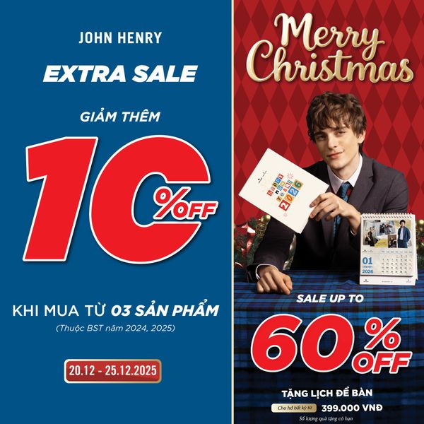 Mùa Giáng Sinh thêm ưu đãi, từ 20 - 25/12/2025, JOHN HENRY mang đến EXTRA SALE giảm thêm 10%, áp dụng đồng thời chương trình giảm giá lên đến 60% đang diễn ra.