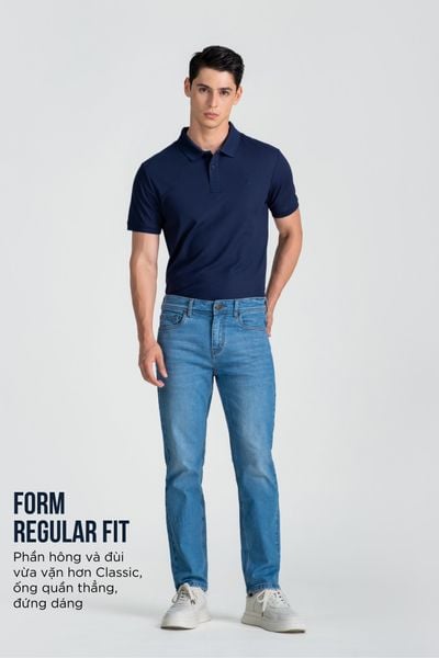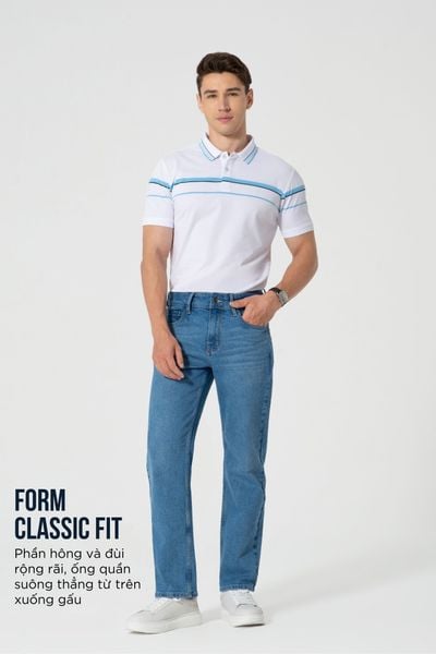 - Hông và đùi vừa vặn hơn Classic, ống thẳng đứng dáng.