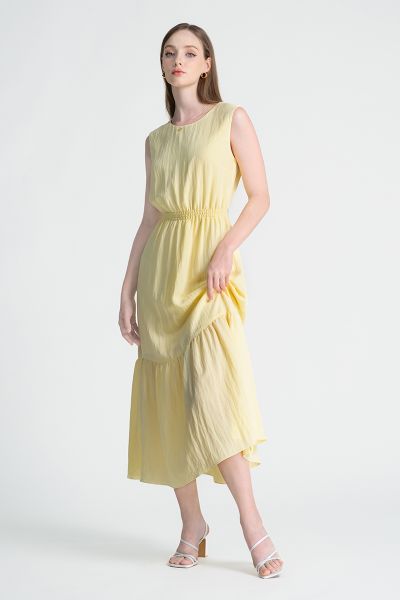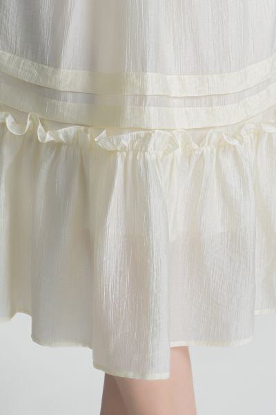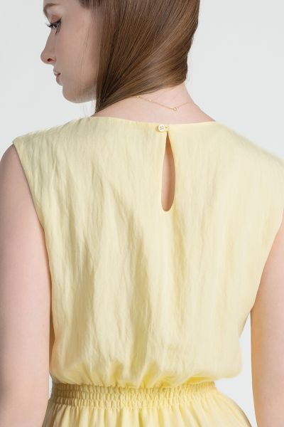 Vẫn là sắc vàng ấm áp nhưng được thể hiện theo cách tinh tế và có chiều sâu hơn. Chi tiết nhún eo nhẹ cùng các đường xếp ly mềm giúp tôn dáng khéo léo, tạo nên vẻ nữ tính vừa đủ, thanh lịch.