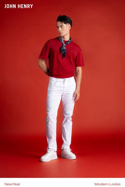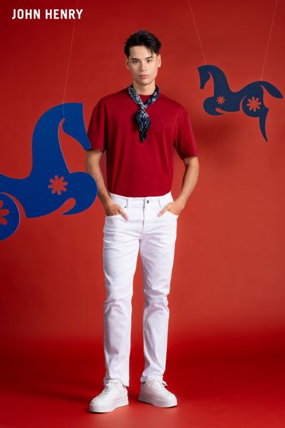 Jeans trắng cũng là item thể hiện rõ tinh thần trẻ trung và phóng khoáng. Khi kết hợp cùng áo đỏ, sự tương phản màu sắc tạo nên hiệu ứng thị giác rõ ràng nhưng vẫn hài hòa. Đây là công thức phối đồ đơn giản, dễ áp dụng nhưng mang lại hiệu quả cao cho những ai muốn làm mới phong cách ngày Tết.